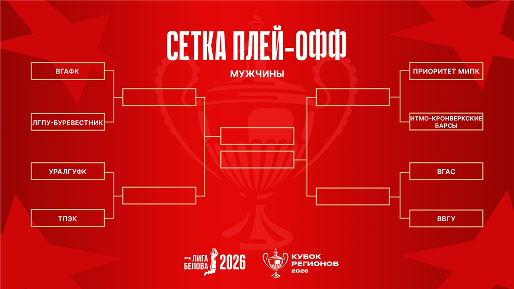 У мужчин сформировались следующие пары: ВГАФК – «ЛГПУ-Буревестник», УралГУФК – ТПЭК, «Приоритет МИПК» – «ИТМО-Кронверкские барсы», ВГАС – ВВГУ.